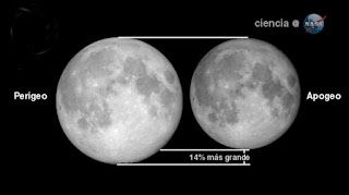 Los científicos señalan que la Luna, en el perigeo, parece un 14 por ciento más grande y un 30 por ciento más brillante que en el apogeo.