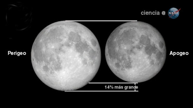 Los científicos señalan que la Luna, en el perigeo, parece un 14 por ciento más grande y un 30 por ciento más brillante que en el apogeo.